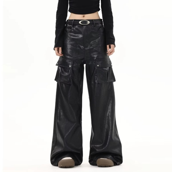 Fashion Women Leather High Waist Street Wide Leg Work Pants
